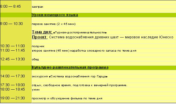 òåàòð, òàíöû). Åæåäíåâíî ïðîâîäèòñÿ ïîãðóæåíèå â íåìåöêèé ÿçûê ïóò¸ì îçíàêîìëåíèÿ