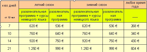 Íîâèíêîé ñåçîíà 2011 ãîäà ÿâëÿåòñÿ äàííîå öåíîâîå ïðåäëîæåíèå, ïîçâîëÿþùåå ñîâìåñòèòü ðàçâëåêàòåëüíî-ñïîðòèâíóþ ïðîãðàììó ëåòíåãî (çèìíåãî) îòäûõà ãðóïï ñòàðøåêëàññíèêîâ èëè ñòóäåíòîâ ñ èíòåíñèâíûì èçó÷åíèåì íåìåöêîãî ÿçûêà.